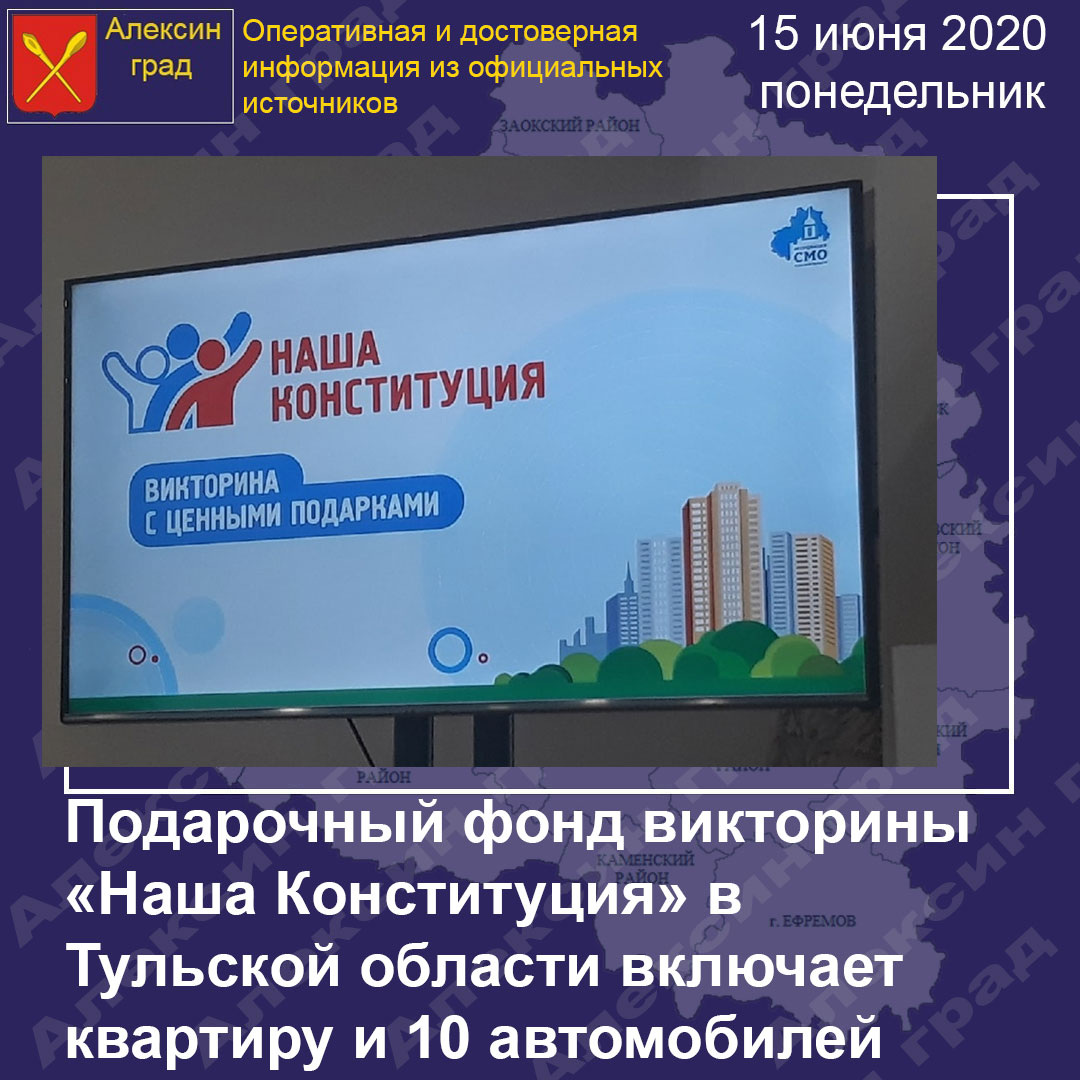 Исполнительный директор Ассоциации «Совет муниципальных образований Тульской области» Ирина Матыженкова рассказала о подарочном фонде викторины «Наша Конституция», которая пройдет в Тульской области в дни проведения Общероссийского голосования с 25 июня по 1 июля. Всего в подарочном фонде более полутора тысяч призов. Среди них 1 квартира, 10 автомобилей, телевизоры, смартфоны, планшеты и фитнес-браслеты. Информация о порядке участия в викторине и распределении подарков размещена на сайте Ассоциации «Совета муниципальных образований Тульской области». Победителям викторины «Наша Конституция», которые правильно ответили на все 5 вопросов и указали контактные данные, необходимо будет явиться в Совет муниципальных образований, предъявить паспорт и уникальный номер анкеты, который находится на отрывном талоне самой анкеты. При таком внушительном подарочном фонде викторины, приоритетным стал вопрос о прозрачности распределения подарков. Так, член организационного комитета викторины, чл