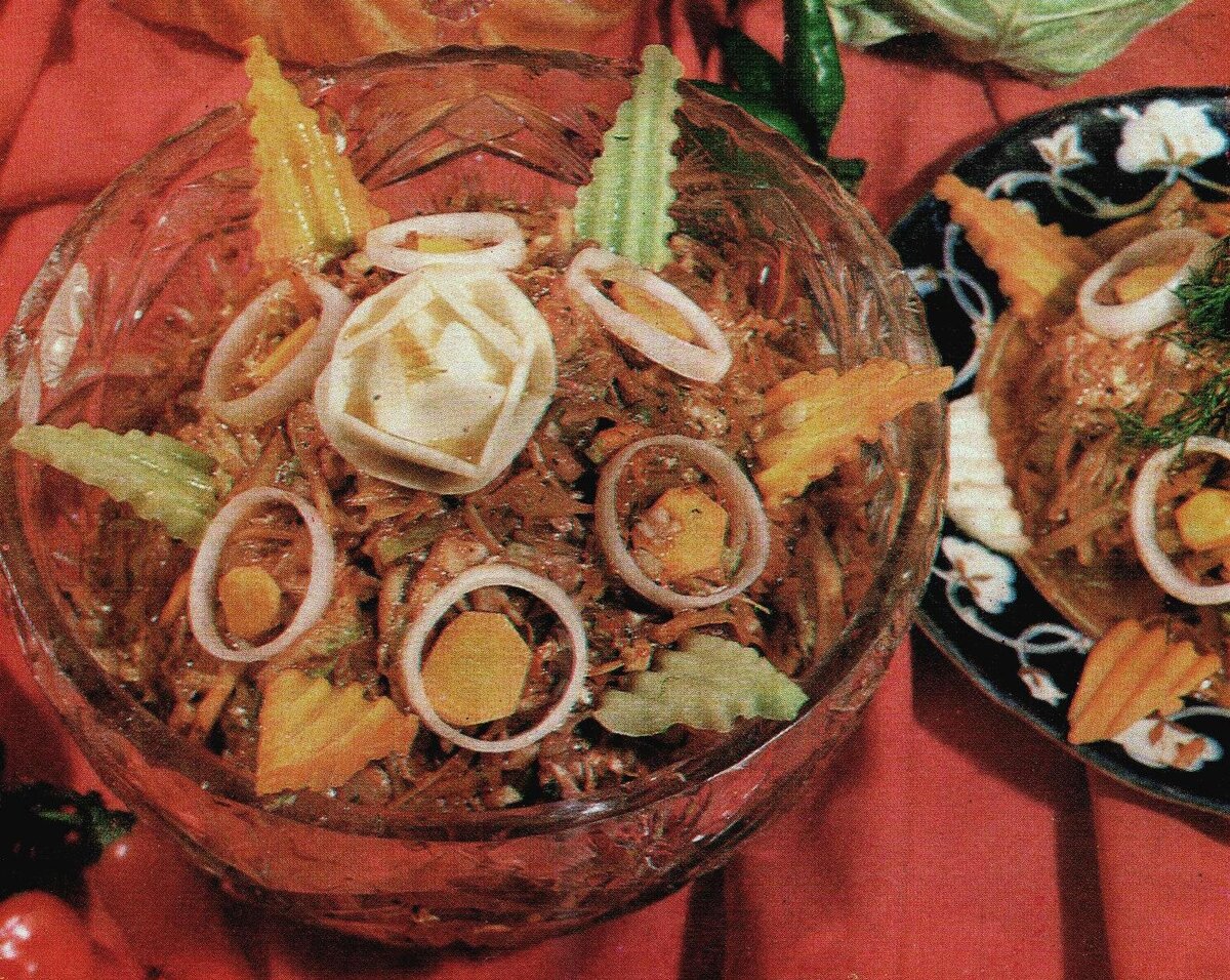 Узбекский салат "Фантазия" - легкий и в то же время сытный. Подойдет для вегетарианцев и возможно для тех, кто вынужден придерживаться особым диетам. В конце приведен список калорийности, содержание жиров, белков и углеводов по каждому продукту. Ингредиенты Приготовление Капустные листья мелко нашинковать, очистить кочерыжки от грубой части и нарезать соломкой. Редьку и морковь натереть на терке. Лук нарезать кольцами и спассировать. Чеснок истолочь или порубить. Соединить все продукты, заправить солью и молотым перцем. Положить томатную пасту, полить перекаленным охлажденным растительным маслом. Салат необходимо мешать руками, обминая пальцами. Уложить в салатницу, украсить зеленью и фигурками, вырезанными из редьки, моркови и лука. Подача Как правила, такой салат подают осенью или зимой. Но это лишь потому что все ингредиенты спеют к осеннему сезону и хранятся до весны. Однако, в наши дни все можно купить в магазине в любое время года. И такой витаминный салат можно приготовить всегд