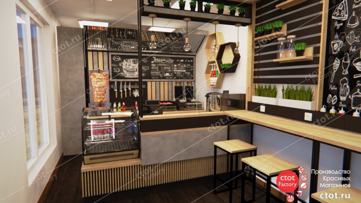 Разработкой и воплощением в жизнь исключительного оформления проекта мини-кафе быстрого питания занимались талантливые специалисты фабрики Ctot Factory