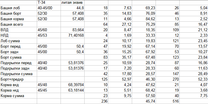Как видно по результатам обследования летом 1942 года в лоб башни приходится 7,63% сквозных пробитий, на лоб корпуса 10,17%. Доля же всех попаданий еще больше в сторону лба корпуса 23,45% против 5,04%. Правда надо отметить что по другому исследованию в 1943 году под Орлом на лоб башни приходится 23% фатальных поражений танка. Но на лоб корпуса все равно немного больше около 27%.Кроме того Курско-Орловская операция очень специфична встречными танковыми, которые не типичны для применения Т-34. По немецкому руководству ПАК-40 для борьбы с Т-34 известно что крышка люка механика водителя пробивалась с 100 метров, ВЛД пробивалась с 500 метров, а башня с 1000 метров. Увеличение маски пушки до 90-мм приводило к уменьшению пробития с 1000 м до 500 м. А литая башня пробивалась с дистанции порядка 600-700 метров. Т.е. по факту маска орудия должна была иметь около 98 мм что бы пробиваться только с 250 м или 102 мм для 100 метров. Отсюда видно что увеличение толщины башни до 90-мм ничего реально не давало - как пробивалась башня на реальной дистанции боя так и продолжала пробиваться. В то же время увеличение только ВЛД до 60 мм утяжеляло танк примерно на 400-500 кг. За то ПАК-40 калиберным снарядом ВЛД больше не пробивало, а подкалиберным пробивало приблизительно с 300-350 метров. Так же удлинение Ф-34 до исходной длинны и добавление остроголового снаряда резко увеличивало мощность выстрела на дистанции в 500 м. Т-34 мог бы легко бороться с модернизированными Т-4.