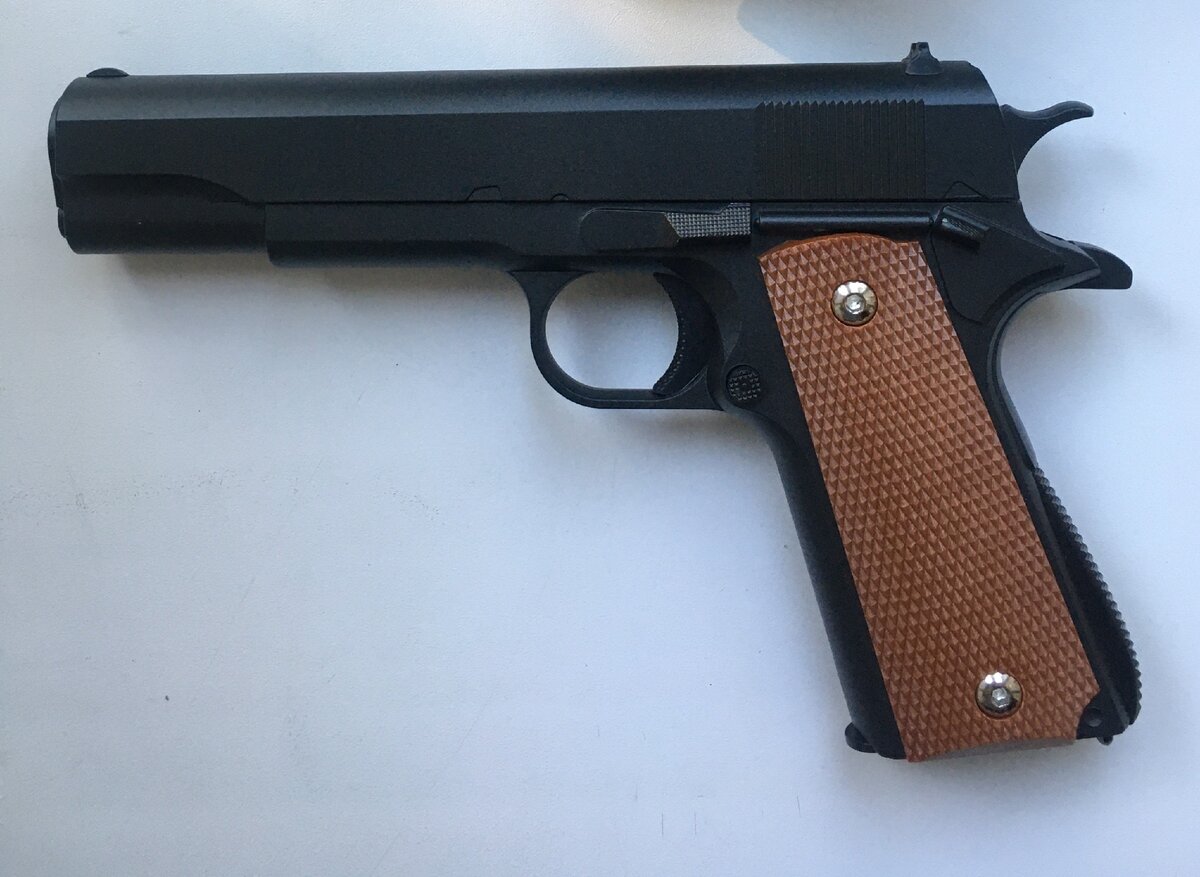 Это реплика пистолета Colt 1911 от китайской фирмы Galaxy, модель G.13+. На коробке написано 12+, хотя обычно на спринговом оружии пишут 18+.