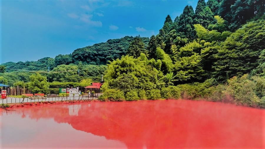 Есть так много мест по всему миру, которые являются довольно удивительными и таинственными сами по себе! Каждый из нас любит жить или посещать живописные и безопасные места.Но есть много мест на Земле, которые несмотря на их красоту считаются опасными для людей. Некоторые из этих опасных мест все еще запрещены для путешествий. Сегодня мы рассмотрим одно из самых опасных мест в Японии - Кровавый пруд. Он существует уже более 1300 лет, и его цвет, как говорят, является результатом какой-то химической реакции, происходящей под землей. Кровавый пруд-одно из самых известных мест в Японии. Он расположен недалеко от японского города Беппу. В Беппу-Сити есть девять горячих источников, от которых идет пар. Каждый из них уникален по цвету и составу, и выглядит совсем не так, как среднестатистический природный родник. Из-за высокой температуры, людям запрещено купаться в этом источнике. Средняя температура воды в нём составляет 194 градуса по Фаренгейту! Вода в этом пруду красная, как кровь. П