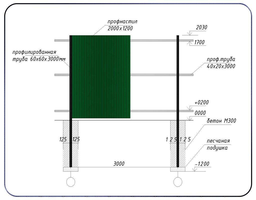 - Для определения числа опор периметр требуется поделить на размер секции. Длина столбов больше высоты профнастила, поскольку их необходимо минимум на треть заглубить в почву. Поэтому для расчета лучше брать высоту столбов 3–3,5 м.