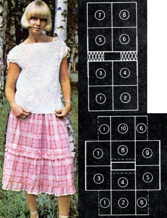 Кофточки вяжем из нитей “кроше” или “снежинка”. Нити хлопчатобумажные. Кофты 44 - 48 размера. Работаем крючками № 1 и № 1,5. Как показано на выкройке, кофты в единое полотно собраны из, отдельно связанных, квадратных мотивов со стороной 23 - 25 см. Для кофточки без рукавов используем 200 г указанной выше пряжи и немного шелковой тесьмы “ляссе”. Вяжем 8 квадратов и соединяем их с изнаночной стороны согласно выкройке по четыре квадрата, получая два полотна - спинку и перед.