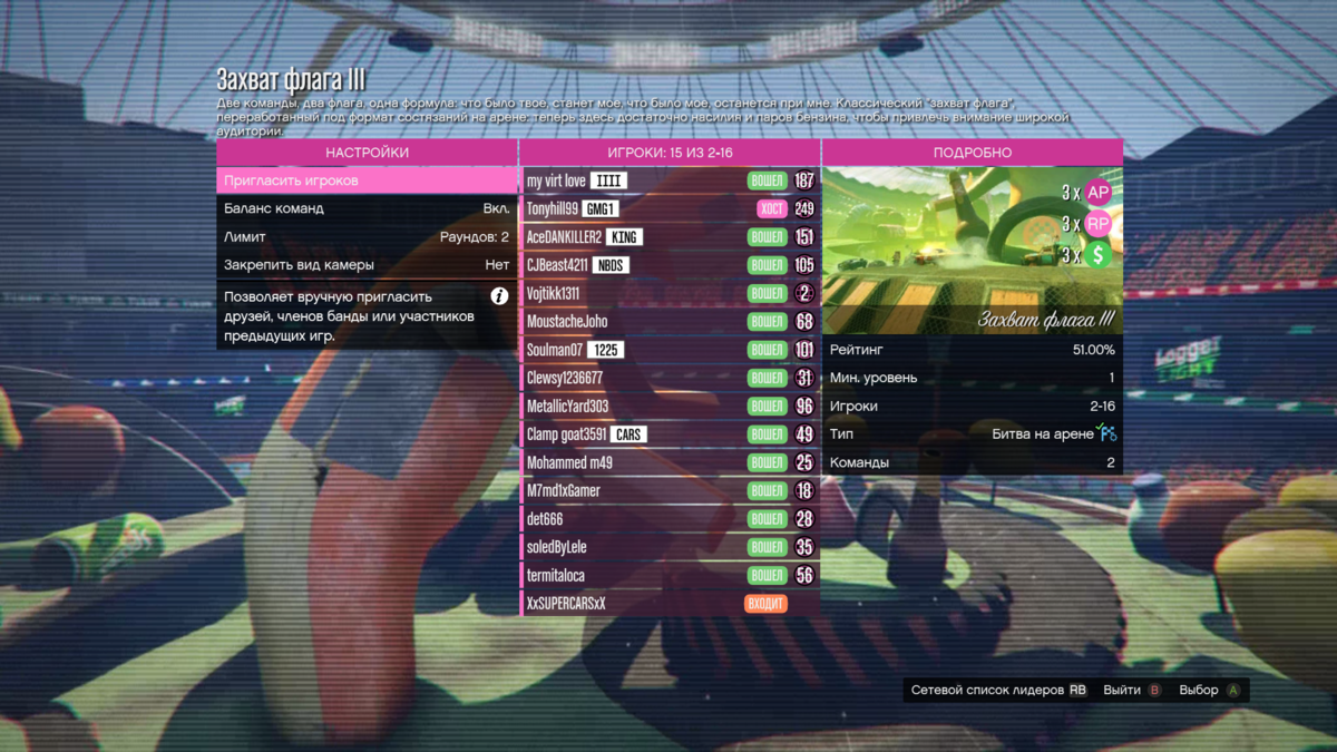 Ну что, наконец я готов опубликовать заметку о фарме на Арене в ГТА онлайн. Есть еще время до обеда четверга разжиться RP и GTA $ пока идут тройные выплаты. Думаю ты и без меня давно догадался как эту акцию обернуть в свою пользу, ну а я расскажу как делаю я. На мой взгляд оптимальный вариант для фарма на арене это "Захват флага", подойдет любой из трех вариантов арен. Но мне больше по душе первый - "Апокалипсис". Фишка в том, чтобы отыграть 7 раундов. Это сократит время загрузки в разы, нежели ты будешь каждый раз играть по 2-3 раунда и снова искать подходящую игру, ждать загрузку. Суть в том, чтобы таскать друг у друга флаги ни на что не отвлекаясь катаясь по кругу. Я иногда уже даже езжу на полном автомате, думая о чем то другом, на столько все просто. Лучший вариант транспорта Deathbike. По ссылке ты можешь посмотреть небольшой ролик-пример: видео. Предварительно не забудь в настройках матча выставить 4 раунда. Мы обычно играем по схеме: 3 раунда выигрываю я, 3 раунда друг, 7ой