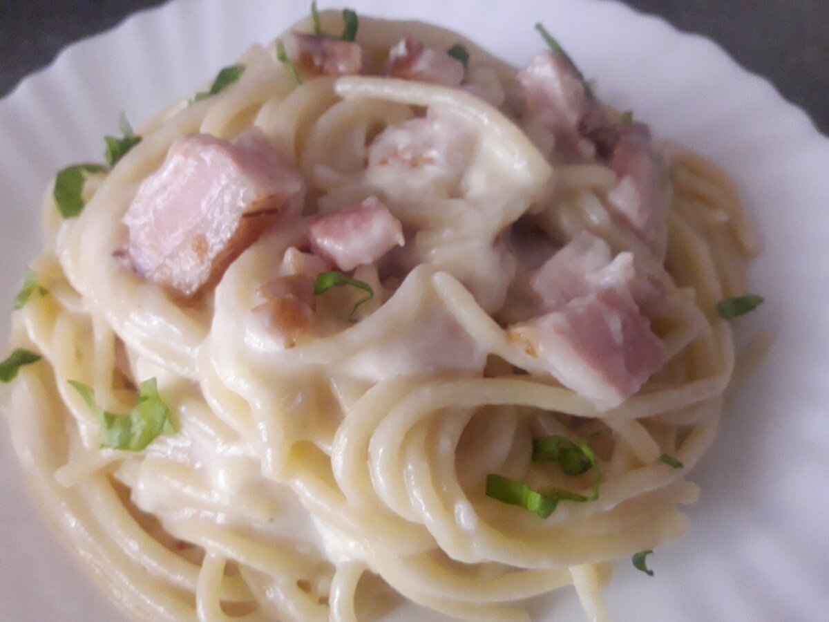 Сырно-чесночный соус на сливках или молоке с обжаренным беконом или грудинкой - настоящая находка для отварных спагетти и любых макаронных изделий. Простота в приготовлении, обычный набор продуктов, который всегда найдется в холодильнике у любой хозяйки, а самое главное восхитительный и превосходный вкус... Итак, приступаем Поставим варить спагетти. Я покупаю из твердых сортов пшеницы. Наливаем в кастрюлю воду, солим и доводим до закипания. В закипевшую воду опускаем спагетти целиком, я их не ломаю Постепенно полностью погружаю их в воду Перемешиваю и варю до готовности. После варки промываю спагетти холодной водой Пока варятся спагетти приготовим ингредиенты для соуса. В миску разобьем одно яйцо Добавим 100 гр. сливок или молоко высокой жирности. У меня деревенское молоко 6% жирности И добавим тертый сыр (от качества сыра будет зависеть вкус вашего блюда), у меня 1/2 стакана, 50-60 гр Перемешиваем массу, можно добавить черный молотый перец, соль я не добавляю, т.к сыр достаточно соле