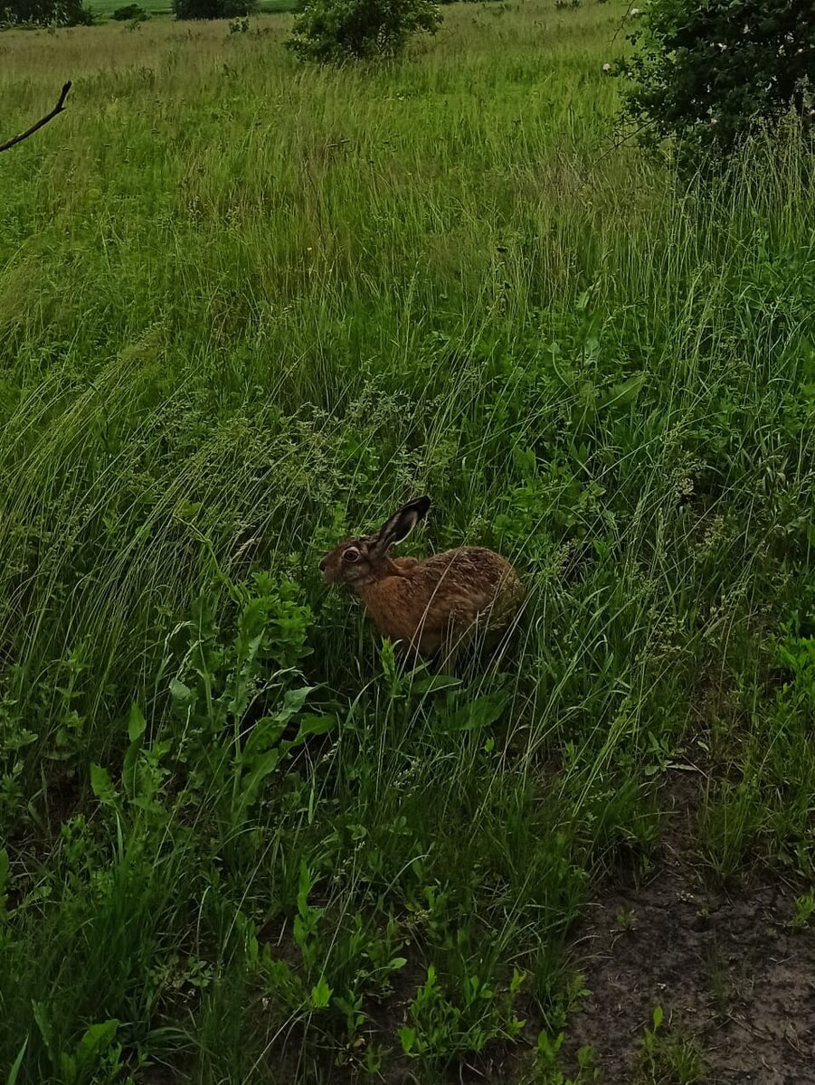 На фото заяц - русак. Я недавно про него на дзене видео выкладывала. Встречается он практически на всей территории России и Тульская область не исключение. Но так близко зайца я видела в первый раз в жизни. Более того, он даже не пытался убежать, а с любопытством подходил к нашему автомобилю, да так, что за уши можно было его схватить. Заяц очень красив. Его летняя окраска рыжевато оттенка. Шерстка его пушистая, блестящая и шелковистая. Животик белый, а кончики ушек и хвостика черные. Предположу, что это молоденький заяц - подросток. Хотя возможно, что это самка. С одной стороны, хорошо что заяц давал себя фотографировать, а с другой, его доверчивость может привести к гибели. Его могут задавить на машине или застрелить браконьеры.