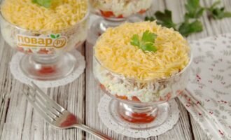 Салат считается очень приятным и легким. Данное блюдо будет прекрасным дополнением для домашних праздников или к гостевому столу.