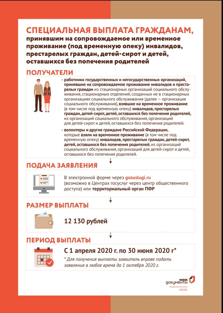 В соответствии с Постановлением Правительства Российской Федерации от 30 мая 2020 г. № 797 «Об утверждении Правил осуществления специальных выплат гражданам, принявшим на сопровождаемое или временное проживание (под временную опеку) инвалидов, престарелых граждан, детей-сирот и детей, оставшихся без попечения родителей» за период с 1 апреля по 30 июня 2020 г. будут произведены специальные ежемесячные выплаты в размере 12 130 рублей. Кому полагается выплата? - работникам государственных и негосударственных организаций, принявшим на сопровождаемое проживание инвалидов и престарелых граждан из стационарных организаций социального обслуживания, стационарных отделений, созданных не в стационарных организациях социального обслуживания, взявшим на временное проживание (в том числе под временную опеку) инвалидов, престарелых граждан, детей-сирот, детей, оставшихся без попечения родителей, из организаций социального обслуживания, организаций для детей-сирот и детей, оставшихся без попечения р