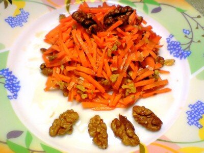 Сервировать в качестве холодной закуски или гарнира к мясу и рыбе. 1) Морковь 2-3шт; 2) Ядра грецкого ореха; 3) Мёд -1 ст.л. Натереть морковь на мелкой терке, посолить и полить лимонным соком. ввести толченные орехи, мед и размешать. Можно украсить салат хорошо отцеженными вишнями из компота. Вкус наслаждения, и орех для мозга=)