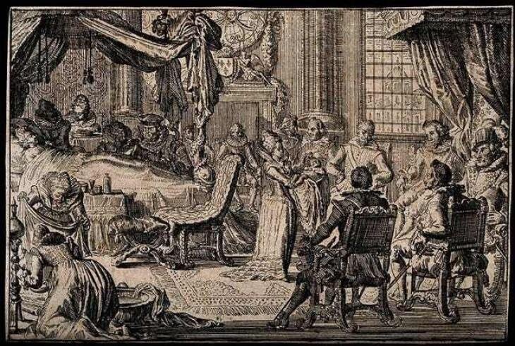 Когда Мария Антуанетта – королева Франции – рожала в 1778 году, в её спальне присутствовали 200 человек. Сам момент рождения ребёнка был так важен, что когда акушерка произнесла слова: «Королева рожает», в эту же самую секунду сотни куртизанок ринулись в затемненную комнату. Король даже приказал специальными шнурами закрепить гобелены вокруг кровати королевы, чтобы их случайно не сорвала бешеная толпа. Сцена была настолько невыносимой, что Мария Антуанетта упала в обморок от жары, а зрители вскарабкивались на мебель для того, чтобы увидеть рождение будущего монарха.