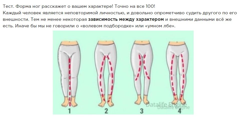Удивительно, однако психологами доказана это взаимосвязь, между внешностью человека и характером. В особенности это касается пальцев на руках и формы ног. Сегодня мы поговорим о ногах. Я была удивлена, насколько точным было описание про меня. Все точно совпало. Чтобы прочти тест посмотрите на все четыре формы и выберете свою Теперь можно смело пройти и УЗНАТЬ РЕЗУЛЬТАТ