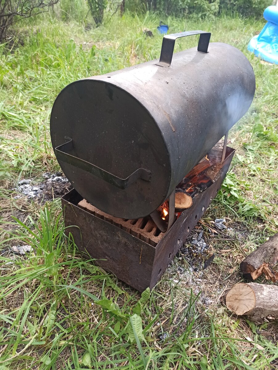 Друг захватил с собой "трубу". Так назвал своё изделие, в котором предполагалось приготовить ужин для всех собравшихся на даче. По мне так, больше напоминает подводную лодку.