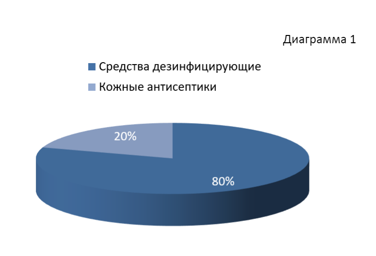 Обеззараживающие средства включают в себя: Какую долю занимает каждая группа можно увидеть на Диаграмме №1 Кожные антисептики и дезинфицирующие средства могут быть одно- и многокомпонетные (комбинированные). Однокомпонетные, как понятно из названия содержат только один вид действующих веществ. Многокомпонетные, как правило, содержат от двух до четырех компонентов. В качестве дезинфицирующих агентов выступают в зависимости от средства: спирты, ЧАС, гуанидины, ПАВ, гексидины, амины, фенолпроизводные, серебро и др. Как распределяются антисептические растворы для кожи в зависимости от числа компонентов показано на Диаграмме №2 Кожные антисептики имеющие в составе одно действующее вещество распределяются в зависимости от антисептического агента так, как показано на Диаграмме №3 Антисептики для кожи с несколькими действующими веществами в составе распределяются в зависимости от количества дезинфицирующих агентов так, как показано на Диаграмме №4. В качестве примера можно привести комбини