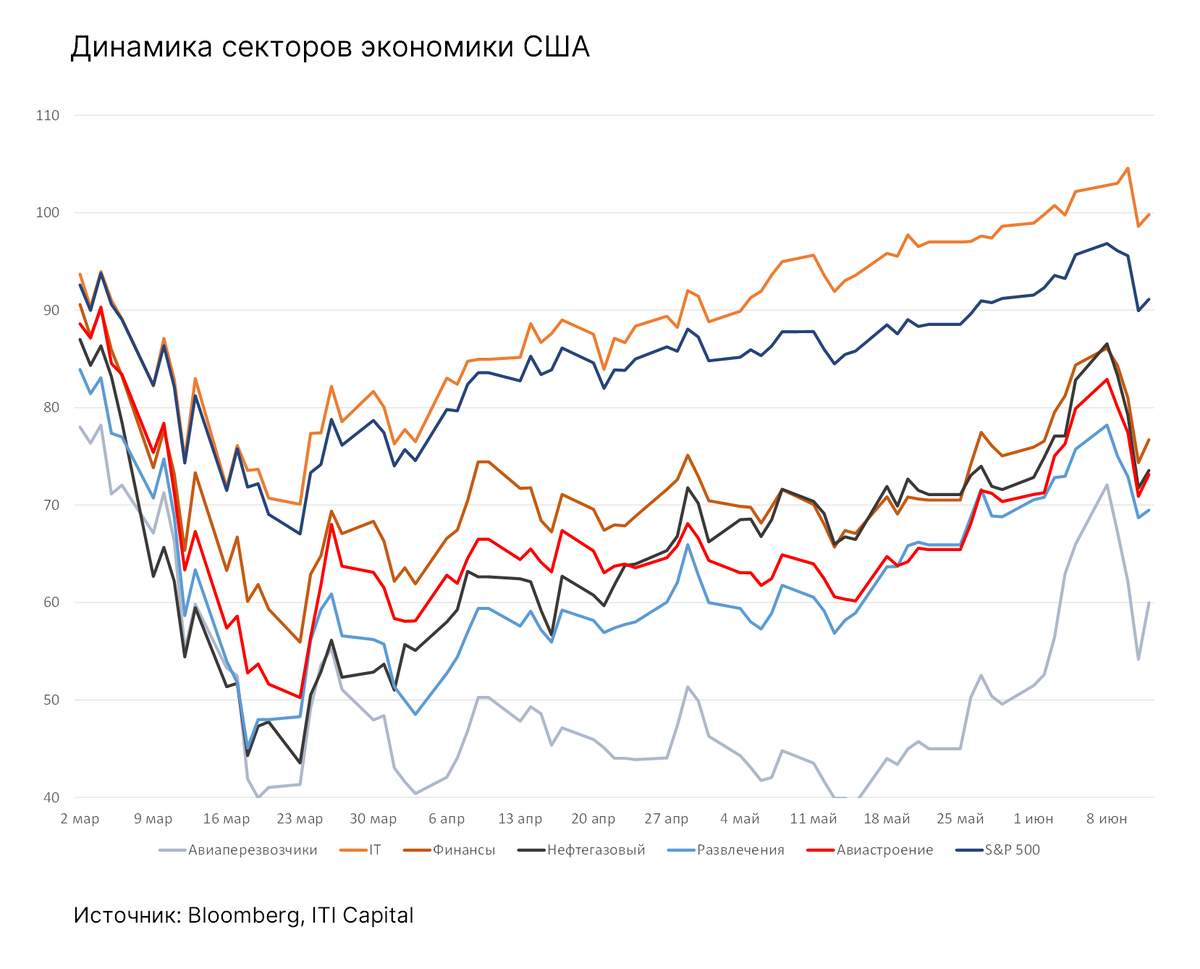Прошлая неделя выдалась волатильной — ралли в ее начале было обусловлено возобновлением глобальной экономической деятельности и улучшением майской статистики, которая указывает на V-образную динамику рынков. В этих условиях к 8 июня S&P 500 вырос до 3 232 п., что лишь на 100 п. ниже максимума 21 февраля, чему способствовал приток наличных средств от населения в наиболее перепроданные сектора, в частности в авиаперевозчиков (UAL, AA, Delta Airlines), Boeing и Southwest Airlines) и круизные компании Norwegian, Royal Caribbean и Carnival, стоимость акций которых в среднем за месяц взлетела более чем на 70%.