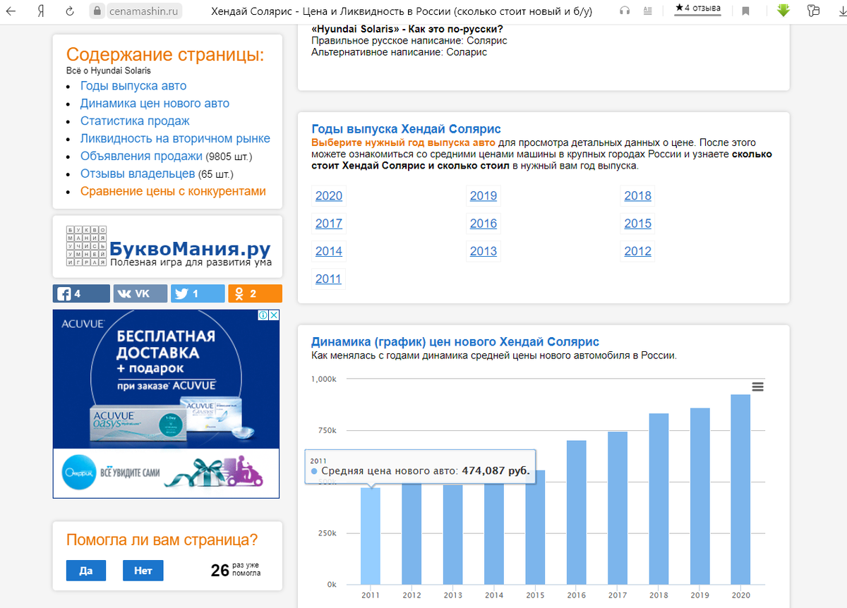 Всем привет. Читал много споров о том, что машины эконом-класса выросли в цене за 10 лет в 2 раза. Давайте проверим так ли это, опираясь на курс доллара. Возьмем среднюю цену нового Хендай Солярис 2011 года: 474087 рублей. Курс доллара в 2011 году был: 28 рублей в середине года, но округлим до максимума в 2011 году был 30 рублей. Итого: 474087/30= 15803$ стоимость нового Соляриса в 2011 году. Теперь берем среднюю стоимость нового Соляриса в 2020 году: 926947 рублей. (полная комплектация 1206000, пустая машинка обойдется в 775000). на 16.06.2020 курс доллара 69,55 рублей. 926947/69,55=13327$. 15803-13327=2476$. То есть Хендай Солярис за 9 лет подешевел на почти 2500$/ При этом, машина стала в разы лучше в плане безопасности и оснащения. Получается друзья, что не машины дорожают в цене, а люди в России беднеют, рубль дешевеет, а соответственно все это сказывается на нашей платежеспособности. Что думаете по этому поводу, пишите в комментариях.