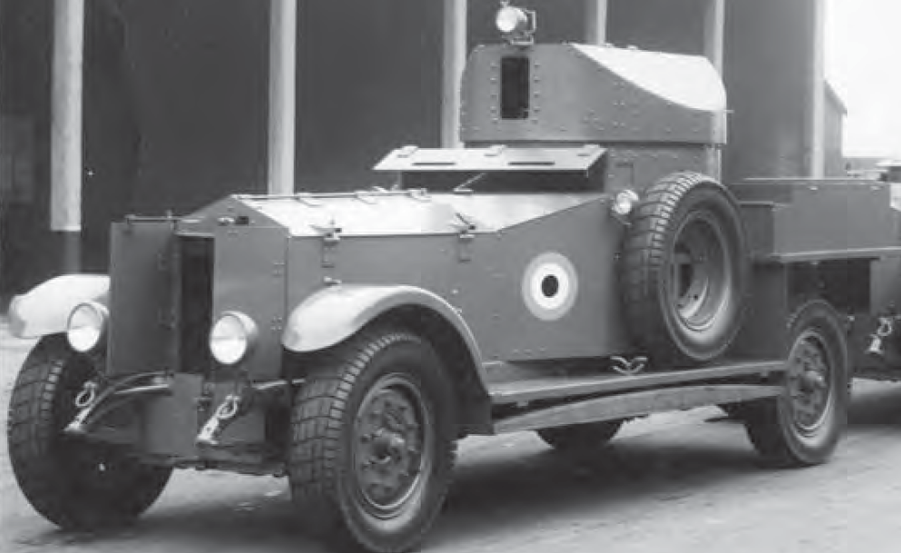 Rolls-Royce 1914/1920 Pattern (модернизированные) Страна изготовления: Великобритания Год производства: 1922-1925 Производитель: Royal Ordnance Factory (Woolwich). Шасси: Rolls-Royce 40/50HP Кол-во выпущенных: 11 (RAF) Боевая масса: 3900 кг Размеры: 4877х1905х2311 см Двигатель: Rolls-Royce 40/50HP 6428ccm, 65 л.с. Максимальная скорость: 95 км/час Бронирование: 8 мм Вооружение: .303 Vickers maschine gun MkI, infantry pattern/+ 1 .303 Lewis gun (армейская модернизация) Экипаж: 2-3 В истории бронеавтомобилей Rolls-Royce Armored Car существует небольшой плохо описанный пробел, который относится к машинам, которые остались после первой мировой войны, но были переброшены в колонии и на Ближний Восток. Фотографий, на которых машины со спицованными колёсами в 20-х - 30-х годах были бы на ходу, отсутствуют, все внимание в описаниях в основном уделяется новым машинам образца 1920 и 1924 годах. Если собирать по крохам, то может получится примерно нижеописанная картина. Но это не точно. Бро