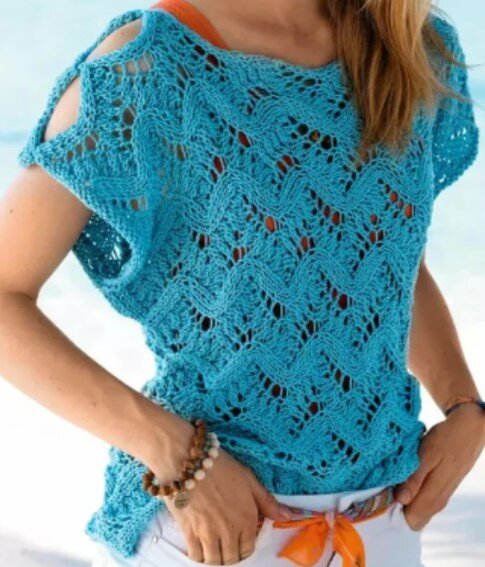 Скромная, но обаятельная ажурная летняя майка цвета морской воды.