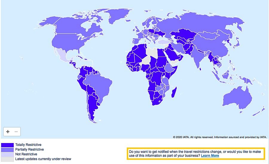 IATA опубликовала составленную на основе данных отраслевого справочника Timatic интерактивную карту мира, где показано, какая степень ограничений международного авиасообщения действует на настоящий момент в той или иной стране. Удобная карта имеет цветовую кодировку в соответствии с правилами, действующими в каждой стране: темно-синий для «полностью закрытых» стран, светло-синий для «частично закрытых», бледно-синий — для стран «без ограничений», белый — для тех, где «информация об изменениях обновляется». Также на карте отображены все правила въезда в те или иные государства, действующие в связи со вспышкой заболевания: ограничения авиасообщения, закрытые границы или обязательное прохождение карантина и так далее. «Частичное» ограничение может означать различные меры: необходимость предъявления отрицательного теста на коронавирус, доступ в страну только гражданам и дипломатам, ограниченный набор стран, откуда могут прилетать туристы и прочее. Данные регулярно дополняются с учетом в