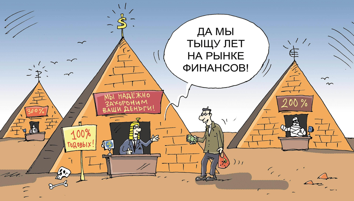 Как устроена финансовая пирамида? Суть предложения, которое поступает всем желающим, очень проста – приносите свои деньги сегодня, а завтра забираете их с прибылью. Причём прибыль, которую обещают устроители, намного выше, чем предложения, которые можно найти в банках. Речь идет об удвоении вклада за месяц, при том, что в банке такого не случится даже за год. И, действительно, на первых порах так и происходит. Люди вкладывают свои средства и свободно забирают их назад с прибылью, которая образуется за счет новых вкладчиков. Именно поэтому и возникло название «пирамида». Если ты в числе первых, то у тебя есть шанс ощутить все прелести мероприятия. Но с течением времени количество участников становится слишком большим, и уже нет тех, кто приносит свои деньги, зато есть большое число тех, кто хочет их забрать. В этот момент и происходит крах, потому что деньги новых вкладчиков перешли старым в виде процентов и возвращать уже нечего и некому. Кто зарабатывает на финансовых пирамидах