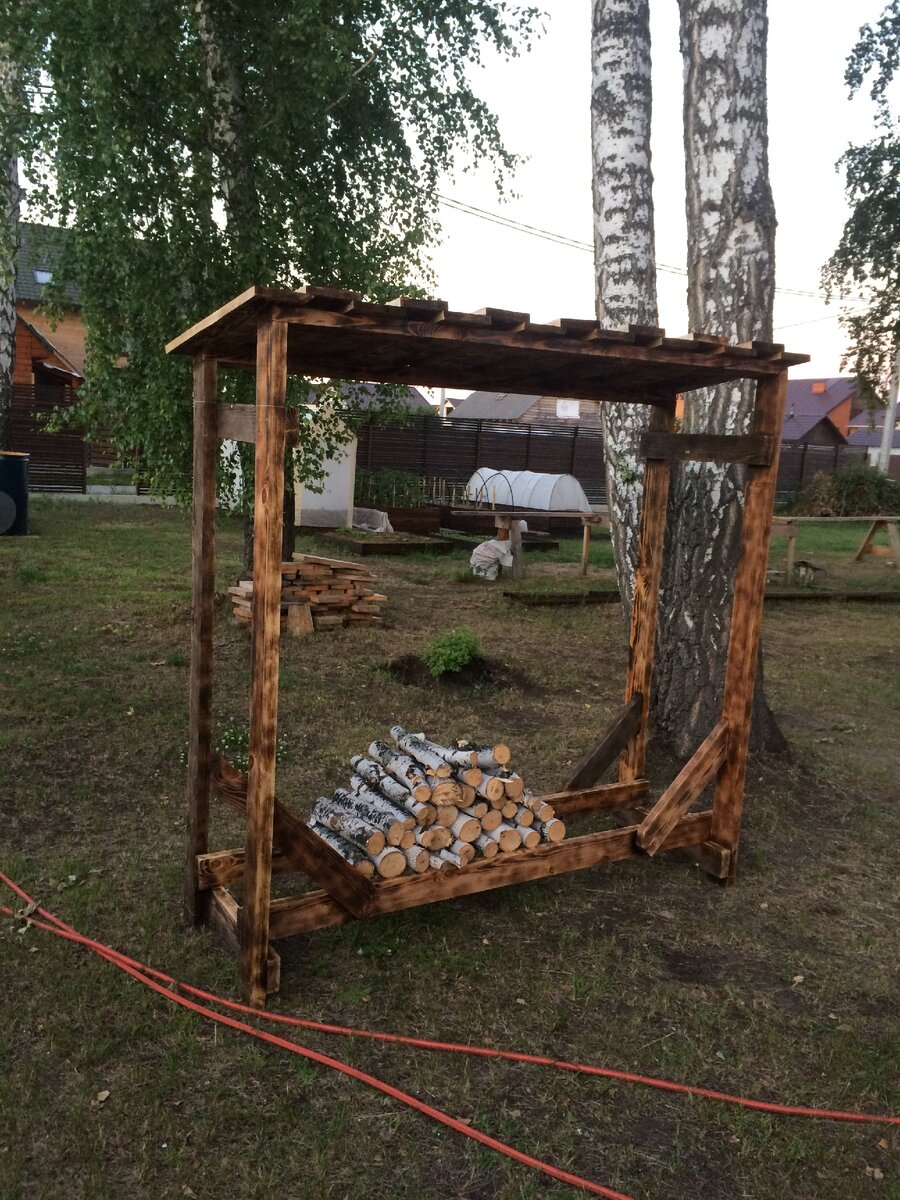 Здравствуйте, друзья. Обрезал на днях мешающиеся ветки на березах и как результат остались не плохие березовые полешки. Выбрасывать жалко, да и для мангала пригодятся) Так что решил сделать небольшой дровник из обрезков досок, оставшихся со стройки.