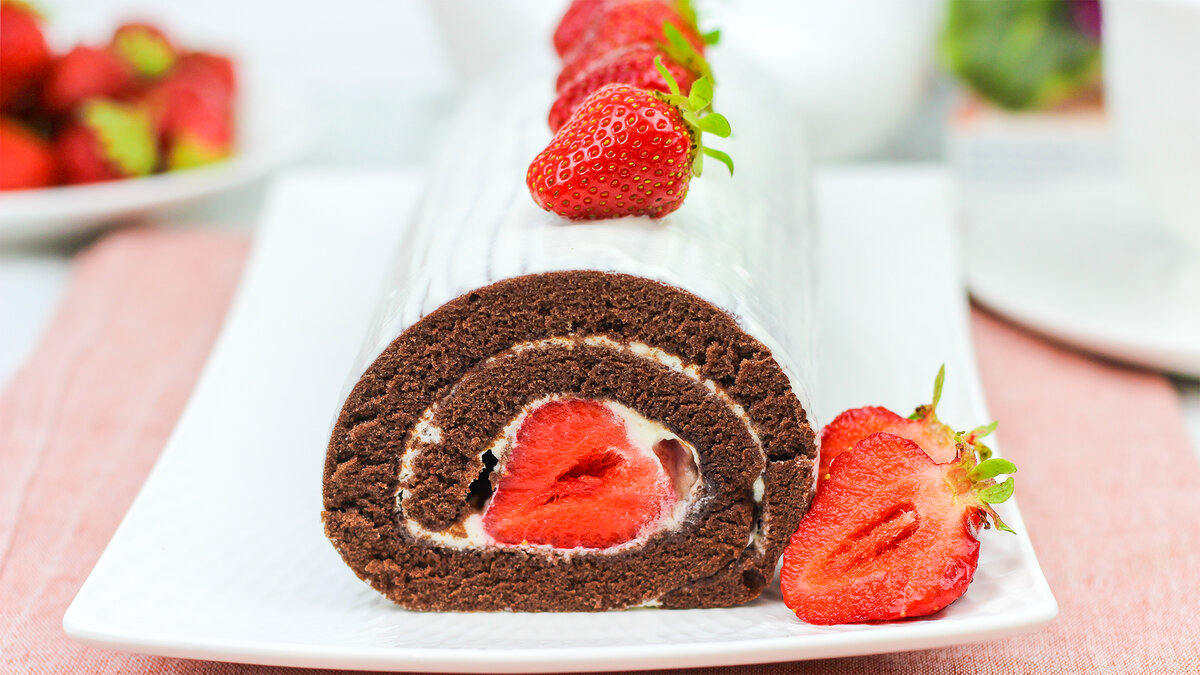 Сочетание свежей сочной клубники, нежного сливочного крема и воздушного шоколадного бисквита - такой рулет никого не оставит равнодушным