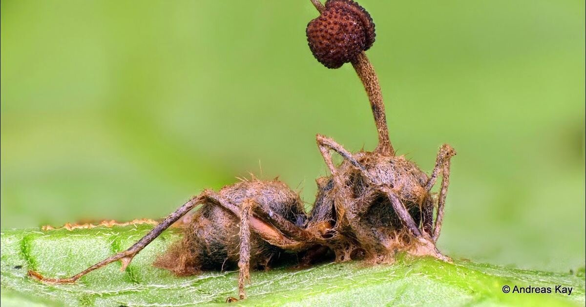 Речь идет о паразите под названием кордицепс однобокий (Сordyceps unilateralis). Обычно споры этого гриба-паразита попадают на тело муравья и прорастают внутрь его организма. Весь этот процесс сопровождается выделением в тело муравья определенных веществ алкалоидной группы, которые и заставляют муравья забыть о своих нуждах и полностью подчиниться паразиту. Пораженные этим грибом муравьи уходят из своего муравейника и начинают скитаться в одиночестве, подыскивая самое благоприятное место для жизни своего хозяина. Именно в этом и состоит главная цель кордицепса однобокого – с помощью муравья добраться до лучшего места, где он смог бы продолжить расти. Поскольку этот паразит не может расти ни высоко в кронах деревьев, ни на земле или близко к ней, муравью нужно отыскать место, где грибу идеально подойдет температура и влажность для размножения. Когда подходящее для паразита место найдено, муравей погибает, и из его головы вырастает гриб, образуя коробочку со спорами. Споры, осыпаясь, п