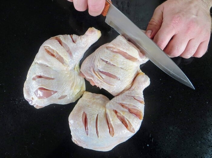 Мясо со вкусом шашлыка на сковороде Интересный способ придать жаренному на сковороде мясу вкус шашлыка. Сегодня делюсь рецептом из куриных окорочков, пожалуй один из любимых рецептов! У меня три куриных окорочка, но так приготовить можно любое мясо. Рецепт: куриные окорочка 3 шт, лук 2 шт, хмели сунели (или ваши любимые специи) 1-2 ч.лож, винный уксус 1 ст.лож, сахар щепотка, соль по вкусу, древесный уголь 1 шт, щепа для копчения. Окорочка надрезаем с обеих сторон, большим ножом (или топориком) можно кости перерубить. Обсыпаем мясо специями (не солим). Отдельно маринуем лук (порезанный кольцами), здесь все просто - щепотка сахара и ложка (две) уксуса. Отправляем лук к мясу, хорошо перемешиваем и оставляем минимум на пару часов (лучше на ночь). Маринованное мясо освобождаем от лука и обжариваем с обеих сторон на сковороде (в небольшом количестве масла). Так как мясо на кости, жарю на минимальном огне, под крышкой, около 30 минут. Мясо готово, добавляем огонь и отправляем в сковородку
