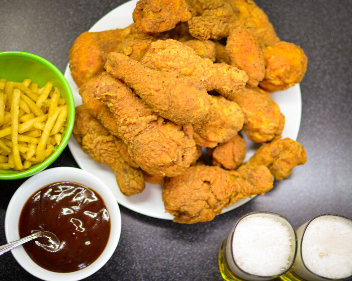 Все граммовки указаны на 3кг курицы, цена указана без учета 2л растительного масла для фритюра (у меня оно было) и пенных напитков)) Курицу покупал в одной из мясных лавок моего города (крылья за кг 120р, голень за кг 160р), в гипермаркетах будет немного дороже.