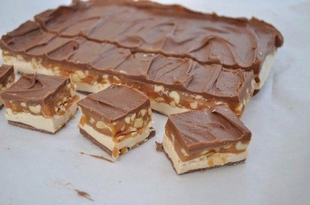 Ингредиенты: Приготовление: Противень с бортиком (у меня 22*33 см) застилаем пергаментом. Половину шоколада растапливаем на водяной бане или в микроволновой печи. Выливаем на пергамент и распределяем шпателем. Ставим в морозилку, чтобы шоколад быстро застыл. Готовим нугу. Мед и сахар кладем в ковшик и вливаем 50 мл воды. Ставим на плиту и на среднем огне доводим до кипения. Варим до 135 градусов по термометру или до пробы на мягкий шарик (капните немного сахарного сиропа в чашку с холодной водой - капля должна застыть, но при этом оставаться мягкой). Пока варится сироп, взбиваем белки до жестких пиков. Готовый сироп начинаем вливать тонкой струйкой во взбитые белки, не прекращая взбивать. Взбиваем до загустения массы. ВЗБИВАЕМ ДОЛГО, ПОКА ЛОПАСТИ МИКСЕРА НЕ НАЧНУТ ВЯЗНУТЬ В МАССЕ! Выкладываем нугу поверх застывшего шоколада и разравниваем. Ставим в холодильник на час. Пока застываем нуга, готовим карамель. Кладем в сотейник все ингредиенты для нее. Ставим на средний огонь и варим, пос