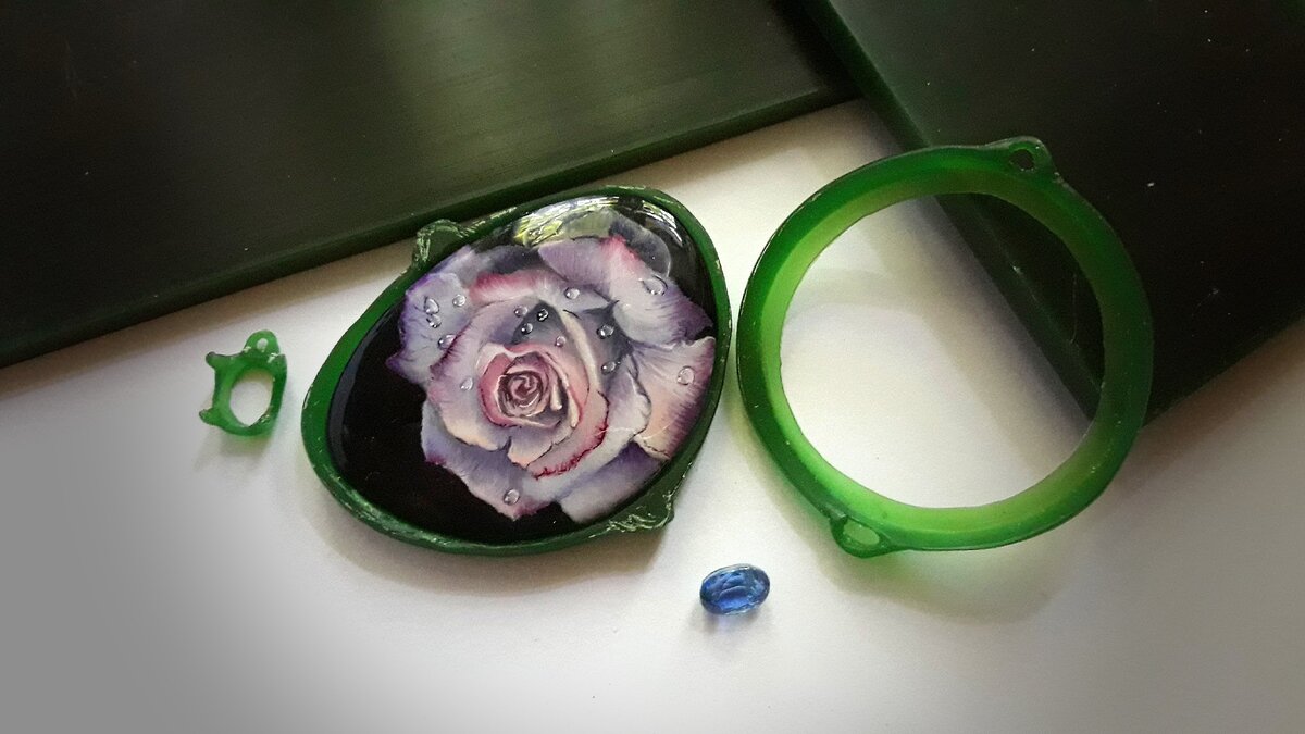 В случае кабошона с розой, я делаю оправу, в которой будет вырезана розочка и с обратной стороны.