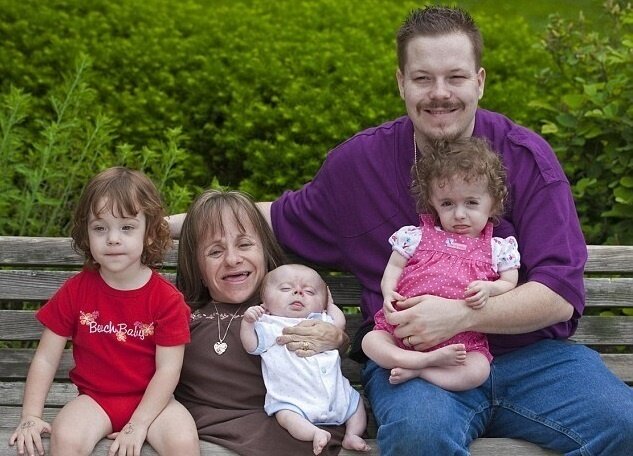 Стейси из Кентукки с рождения страдала редким генетическим заболеванием — несовершенным остеогенезом, из-за которого кости становятся слишком хрупкими, а легкие остаются слаборазвитыми. Из-за болезни девушка выросла до 71 см, передвигаться она могла только на коляске. Тем не менее болезнь хрустального человека, как ее еще называют, не помешала Стейси получить образование и найти работу, рассказывает Rambler. Девушка была кассиром в ближайшем к дому супермаркете. Там она познакомилась со своим будущим мужем Уиллом Геральдом. Влюбленным не мешала разница ни в росте, ни в возрасте. Уил был выше Стейси на метр и младше на 9 лет. В 2004 году они поженились и, конечно, хотели детей. Врачи были категорически против, однако Стейси слушала свое сердце и решилась на беременность. На 28 неделе родилась девочка Кэтрин, она весила около одного килограмма, но смогла выжить. Позже выяснилось, что ей передалась болезнь матери. Через год Стейси снова забеременела и вопреки предупреждениям врачей в