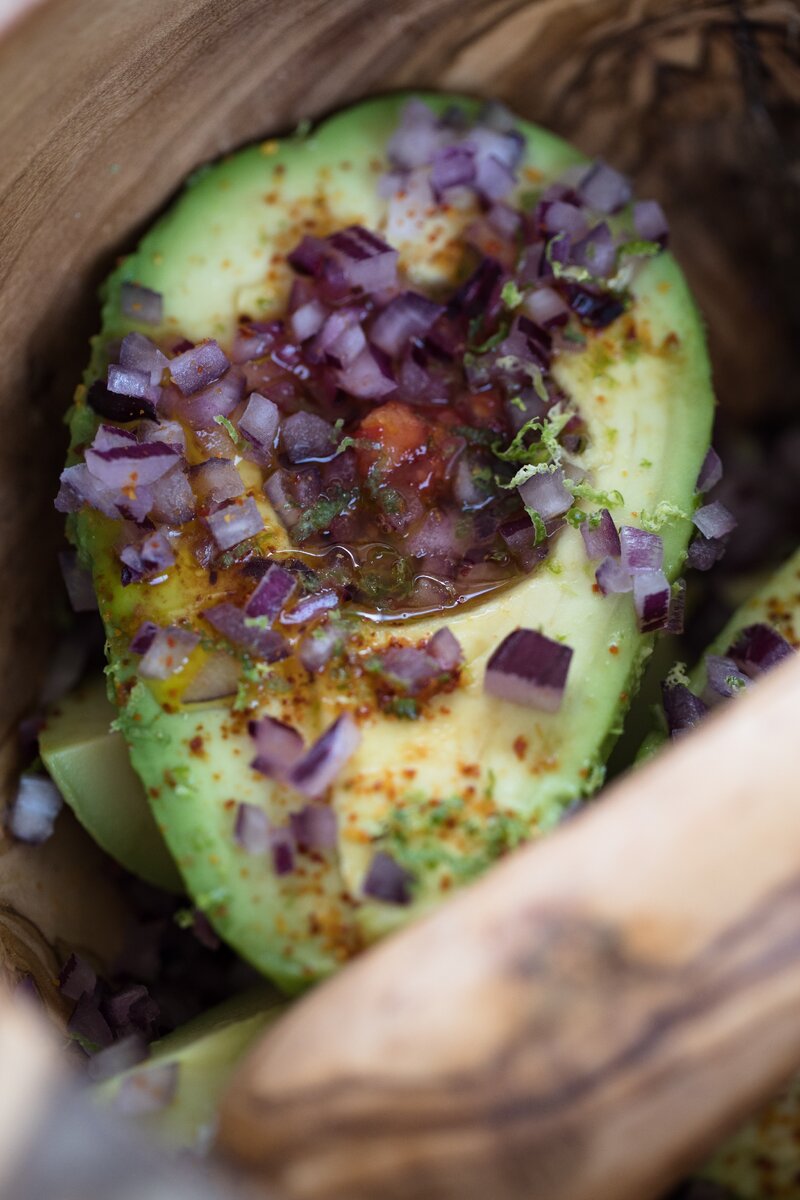 - С помощью ложки или вилки измельчить авокадо и смешать со всеми ингредиентами