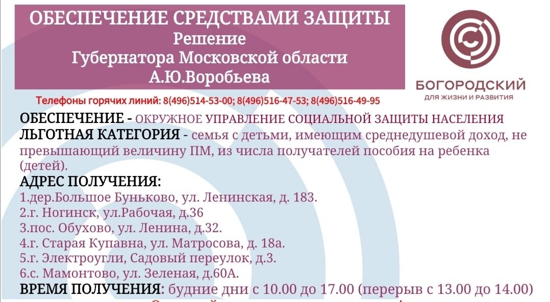 По поручению губернатора Московской области Андрея Воробьёва в Богородском округе начинается обеспечение малообеспеченных семей и малоимущих пенсионеров средствами индивидуальной зашиты.