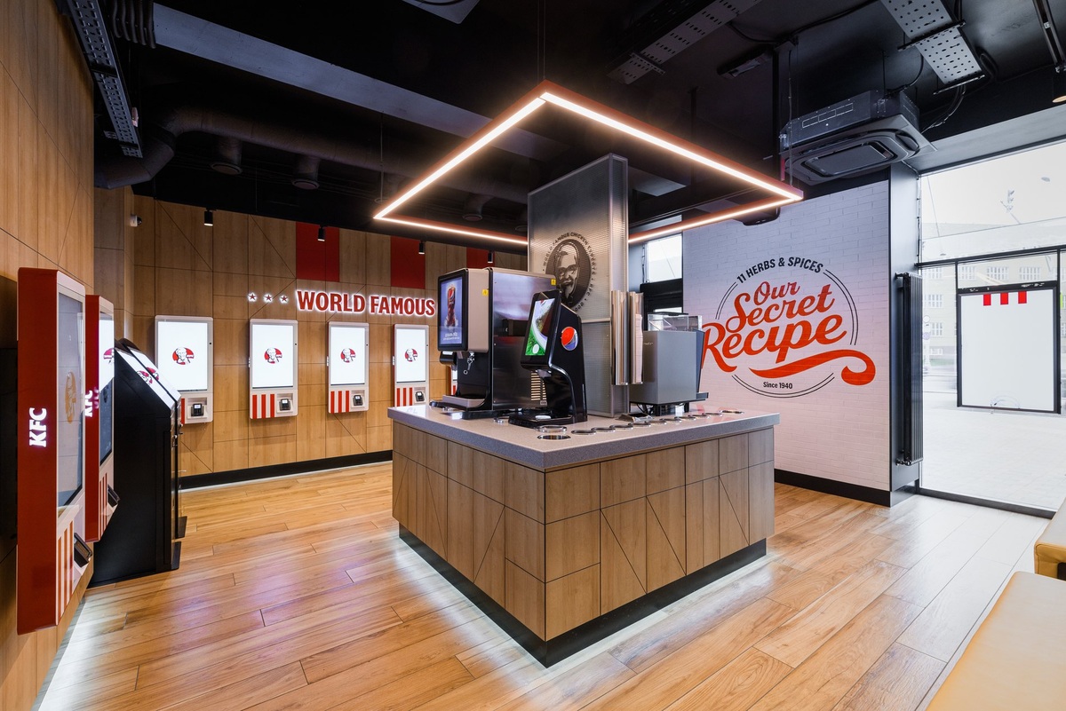 Здесь нет кассиров, выдачей блюд занимается роборука, а для оплаты и получения заказов задействована система терминалов. В ресторане доступна функция click & collect — гость может оформить заказ в приложении KFC и забрать его в указанное время из ячейки в ресторане. В ресторане 11 терминалов. Все они оснащены биометрическими датчиками и при каждом заказе система запоминает клиента. Если около датчика стоит несколько людей, то система запоминает человека, который ближе к ней. После того, как клиент забрал заказ, данные удаляются, но если вы зарегистрированы в системе или участник программы лояльности, то они сохраняются. В KFC уверяют, что система безопасна и интернет требуется только для функции click & collect. Гости могут наблюдать, как формируется и движется по конвейеру заказ, а потом роборука помещает его в ячейку, где он хранится не более 10 минут. Ячейка открывается автоматически с использованием системы распознавания лиц, которая также установлена на аппараты автоматическог