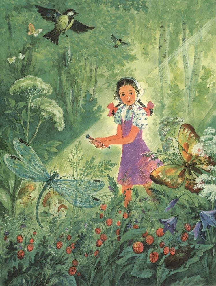 Однажды Катя, внучка лесника из ближней деревни Ивана Петровича, собралась в лес по ягоды. Выдал ей дедушка корзинку, указал тропинку и сказал: - Иди по тропинке, выйдешь на полянку, там и ягод наберёшь, по тропинке и домой вернёшься. Взяла Катя корзинку, пошла по тропинке. Хорошо утром в лесу: солнечные лучики сквозь листву да хвою пробиваются, в росинках отражаются, птички поют и под каждым кустиком – гриб или ягода… Вот пересекkf Катину тропку, другая тропинка, необычная – полоска вздувшейся рыхлой земли, Катя знает (ей дедушка рассказывал) – это крот свой подземный ход рыл, а вон, за тропкой и горка земли с отверстием сверху – там крот вылезает, чтобы свежим воздухом подышать… Вот, у лужицы – мелкие синие цветочки, это незабудки – увидишь их, и правда, уже не забудешь… А вот села на ветку птичка-невеличка, трель пустила, будто говорит: «Посмотри, Катя, какая я красивая!» Знает Катя и птичку – зябликом её зовут… Много чего Кате дедушка про зверей и птиц рассказал, многое показал,