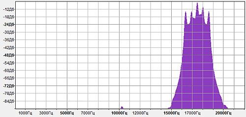 Внешний вид сигнала в Audacity наводил на мысль, что используется какая-то частотная модуляция, причем шел один сигнал, дальше небольшая пауза, затем визуально такой же сигнал снова. Общая продолжительность — полторы секунды. Раз модуляция частотная, то неплохо бы взглянуть на спектр. Посмотрел график — на нем отчетливо выделялось пять пиков на одинаковых расстояниях друг от друга в районе 16-19КГц: