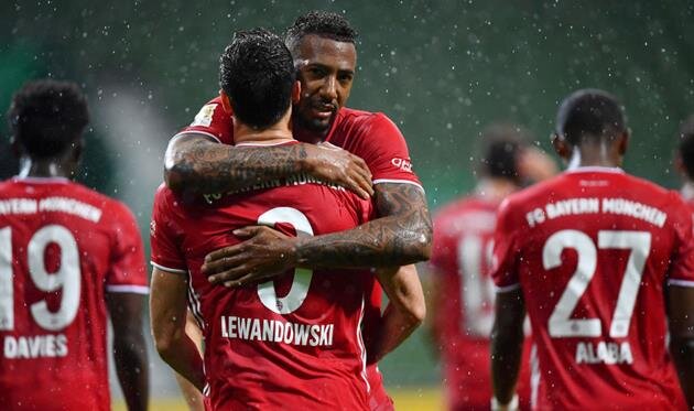 Выиграв свой выездной матч 32 тура в Бремене, мюнхенская Бавария за два тура до окончания сезона досрочно завоевала юбилейный, тридцатый титул сильнейшей команды Германии. «Вердер», который находится в зоне вылета, пытался зацепиться за ничью в игре с фаворитом. Как знать, если бы игра проходила при заполненных трибунах, возможно, «музыкантам» было бы легче воплотить в жизнь поставленную задачу. Гости в первом тайме владели заметным преимуществом, но смогли открыть счет только в самой его концовке, когда на 43 минуте Роберт Левандовски замкнул пас Боатенга, забив гол с близкого расстояния. Во втором тайме хозяева пытались отыграться, и имели пару моментов, но Мануэль Нойер спас свою команду от пропущенного гола, отбив на последних минутах коварный удар Осако. На 79 минуте матча Бавария осталась вдесятером, но не позволила сопернику забить гол. Таким образом, даже если в сегодняшнем матче дортмундская Боруссия и обыграет «Майнц-05», догнать Баварию желто-черным уже не удастся. За Борус