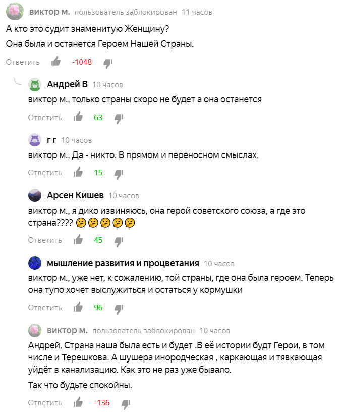 Посмотрел комментарии к предыдущей статье "О Терешковой нужно забыть, она враг народа", и обнаружил, что некоторые по-прежнему считают Терешкову героиней, и написали мне кучу гадостей за то, что я назвал её тем, кем она и является — изменником родины. А особенно, меня умиляют те, кто пытаются обвинить в измене Родины меня. Как раз я один из немногих, кто не предал свою Родину — Советский Союз, в отличие от защитников Терешковой, поддерживающих Путина. Вот некоторые комментарии.