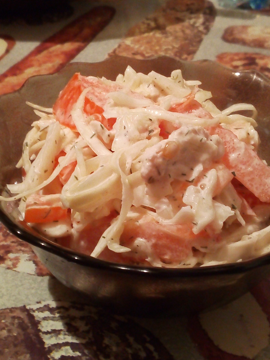 Блюдо готовится просто и быстро, а поглощают его еще быстрее. Нарежьте капусту или натрите на ломтиками , а зелень измельчите. Грудку нарезать соломкой. Сложите все ингредиенты в салатницу. Ингредиенты: Куриная грудка: 200 грамм Капуста белокочанная: 300-400грамм, Помидор: 1 Штука, Чеснок: 1 зубчик, Майонез: По вкусу, Соль, перец, зелень: По вкусу Приготовление: Куриную грудку отварить ( минут 40) и порезать соломкой или кубиками Капусту нашинковать и немного примять руками Нарезать помидор соломкой и добавить к капусте, выдовить через пресс зубчик чеснока Затем добавляем порезанную грудку, солим, перчим по вкусу, посыпаем свежим укроп. Добавляем немного майонеза и перемешиваем. Наш салат готов! Приятного аппетита!