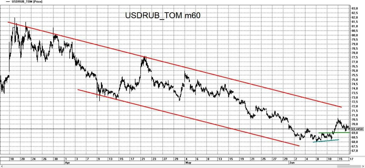 Валютная пара USDRUB, по-прежнему торгуется в понижательной ценовой тенденции, развивающейся со второй половины марта этого года от уровня 82 рубля за доллар. Пока данная тенденция является главенствующей. В рамках этой тенденции от уровня 68 рублей за доллар произошел отскок вверх до уровня 70,50 рублей за доллар. Соответственно от уровня 68 начинает формироваться поддержка. Ближайший уровень, на который сегодня стоит обратить внимание, это уровень 69 рублей за доллар. На данном уровне 09.06.20, 10.06.20 формировалось локальное сопротивление, которое было преодолено вверх 11.06.20. В настоящее время цена вновь приближается к данному уровню, но уже сверху вниз. В техническом анализе считается, что бывший уровень сопротивления зачастую становится поддержкой. Соответственно, если с текущих значений начнут превалировать покупки со стороны участников рынка, которые не позволят опуститься цене инструмента ниже уровня 69, то далее можно будет ожидать рота с целью преодоления предыдущего лок