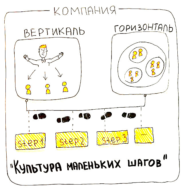 Переход от традиционной вертикали власти и иерархии к плоской структуре невозможно осуществить моментально. Он должен происходить постепенно - пригодится культура маленьких шагов. В этой концепции процесс любых конструктивных изменений в подразделении или компании раскладывается на микро шаги. Задачи и проблемы, с которыми работает команда, решаются следующим образом: на встрече четко обозначаются проблема и действия, которые необходимо предпринять для ее решения в течение недели. Если указывать длительные сроки, то действие в итоге может оказаться бесполезным - появятся новые законы в компании, произойдут изменения, при которых совершаемое действие уже не принесет никакой пользы. Также важно указать кто отвечает за выполнение действия. Это компетентный человек, который готов взять на себя ответственность и больше всех радеет за успех дела. Таким образом, на каждой встрече должен быть зафиксирован конкретный микрошаг. необходимый для решения задачи. Когда действие совершается нескол