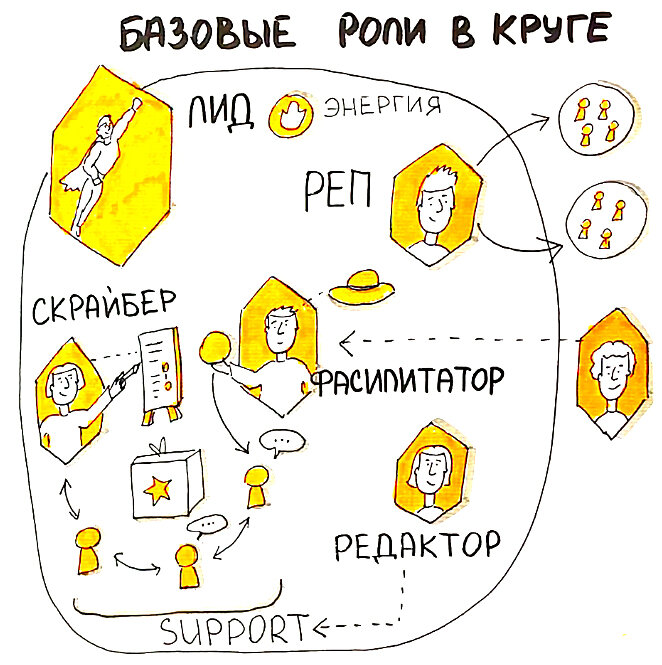 Круги - это составляющие горизонтальной плоской структуры организации, самоорганизующиеся команды. В кругах могут быть различные функциональные роли - они решают задачи, связанные с деятельностью круга и его предназначением. Также в кругах есть базовые роли, которые нужны, чтобы работала методология SELFORG - самоорганизации и встречи проходили эффективно. Во-первых, это роль лида. Лид - это энергия круга, это тот, кому не все равно, кто больше всех переживает за дело, радеет за его успех. Это совсем не обязательно тот, кого вы привыкли видеть в качестве руководителя. Во-вторых это роль фасилитатора. Он отвечает за устный продукт коммуникации на встречах, управляет ими дает слово, забирает, передает и так далее. Атрибут фасилитатора - его шляпа. Часто команда приглашает внешних фасилитаторов. В-третьих, эта роль скрайбера. Он отвечает за письменный продукт встречи - фиксирует все, что на ней происходит - все выводы и решения. Также, его ответственность - подготовка к встрече всех
