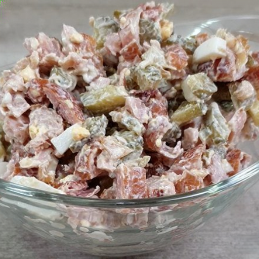 соль, майонез. Сегодня готовим салат-закуску с копченой курицей и грецкими орехами. Его можно подать как отдельный салат, а можно подать в тарталетках как закуску. Процесс приготовления салата с копченой курицей и грецкими орехами. 1. Если вы это блюдо будете готовить как салат, то продукты не обязательно нарезать очень мелко. Но если же вы будете готовить как закуску, то желательно нарезать как можно мельче. Мы будем готовить салат. Нарезаем копченую курицу. 2. Нарезаем соленые огурцы. 3. Нарезаем отваренные куриные яйца и добавляем их к салату. 4. Сюда же добавляем грецкие орехи, зубчик чеснока и майонез. 5. Салат хорошо перемешайте, а затем попробуйте на соль. Если будет необходимость, то добавьте соль. 6. Салат-закуска готов. Как видите, готовится такой салат невероятно быстро. Продуктов для такого блюда необходимо самый минимум. Получается салат очень вкусным и сытным. Приятного аппетита! Время приготовления: 5 минут