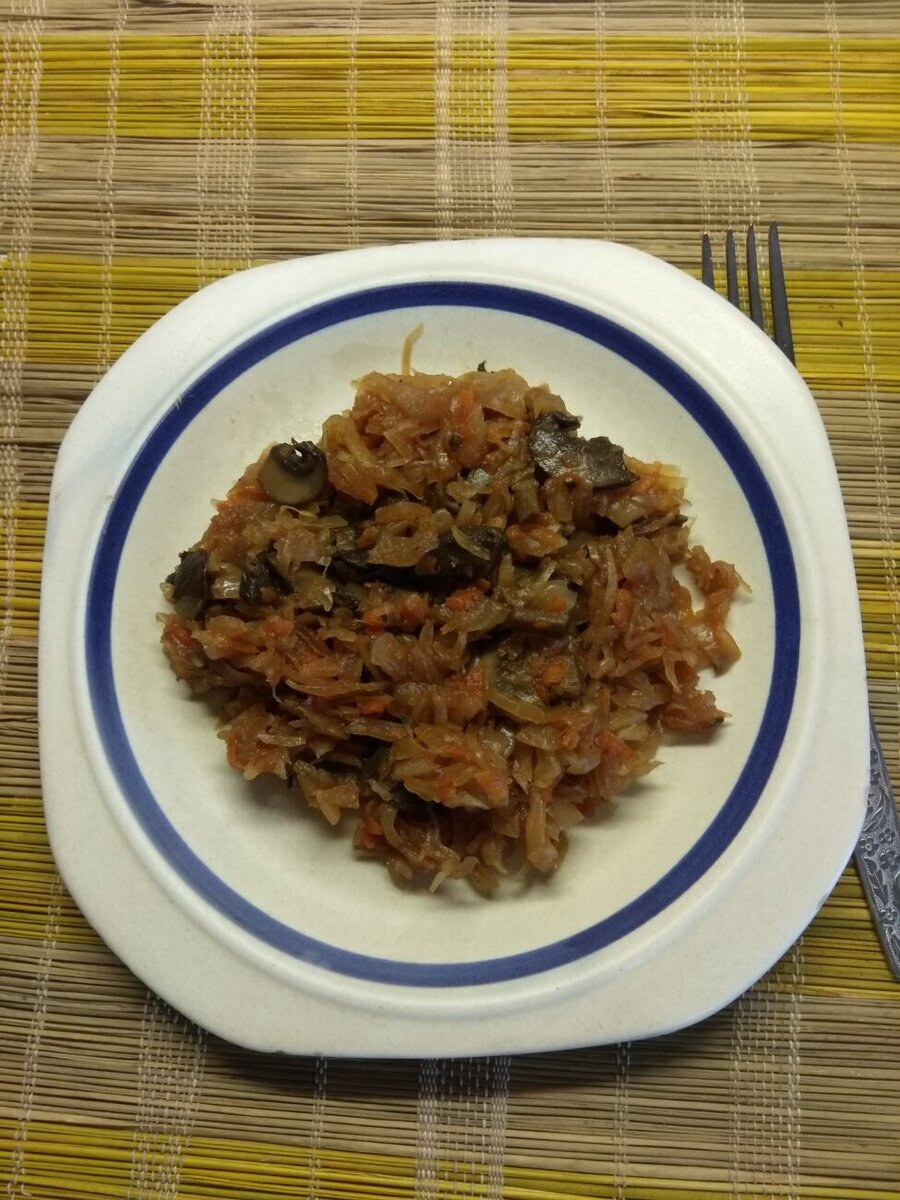 Всем привет,сегодня мы приготовим капусту с шампиньонами.Приступим к приготовлению. Нам понадобится: Дальше делаем следующее: 1. Капусту помыть, удалить верхние листы и тонко нашинковать. 2. Лук помыть, очистить от шелухи и произвольно нарезать. 3. Морковь помыть, очистить и натереть на крупной терке. 4. Шампиньоны помыть и нарезать пластинками. 5. Все овощи сложить в глубокую кастрюлю, посолить, добавить томатную пасту. Влить немного воды. 6. Тушить в духовке при 180 градусах 1-1,5 часа.На этом все,капуста с грибами готова,всем спасибо за просмотр,не забудьте подписаться и поставить лайк,также написать комментарий.Всем удачи,всем пока.