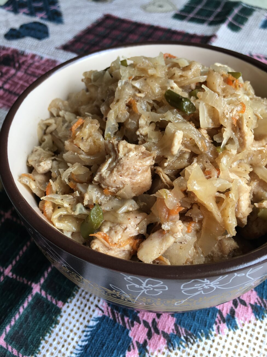 Всем привет,сегодня мы приготовим вкусную солянку на обед.Приступим к приготовлению. Нам понадобится: Дальше делаем следующее: Куриное филе промываем, нарезаем небольшими кусочками. Растительное масло разогреть на сковороде. Обжарить на сковороде кусочки куриного мяса до румяности. Добавить 1/2 стакана воды и тушить мясо до полуготовности минут 10 на небольшом огне под крышкой (если необходимо, воды можно еще подлить). Пока тушится мясо почистить лук и морковь. Лук порезать полукольцами, морковь натереть на мелкой терке. Также, нашинковать капусту. Когда жидкость испариться, забросить в сковороду лук, жарить до полупрозрачного состояния. Затем добавить морковь, обжаривать около 2-х минут. К зажарке добавить нашинкованную капусту. Тушить под закрытой крышкой периодически помешивая до готовности. В конце приготовления добавить специи для овощей, соль и чесночные стрелки (вы можете добавить любую зелень). Перемешать, тушить капустную солянку еще 2-3 минуты, затем выключить огонь. Можно п