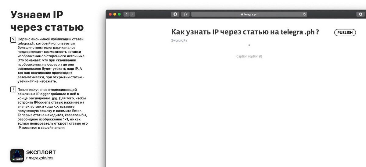Как узнать IP через статью на telegraph Сервис анонимной публикации статей telegra.ph, который используется большинством телеграм-каналов поддерживает возможность вставки изображения со стороннего источника. Это означает, что при скачивании изображения, на сервер, где оно расположено будет утекать наш IP. А так как скачивание происходит автоматически, при открытии статьи - утечки IP не избежать. После получения отслеживающей ссылки на IPlogger добавьте к ней в конце расширение .jpg. Для того, чтобы встроить IPlogger в статью нажмите на значек вставки кода <>, вставьте полученную ссылку и нажмите Enter. Теперь в статье находится, казалось бы, безобидное изображение 1x1, но как только пользователь откроет статью его IP появится в вашей панели Данный баг не работает при открытии статьи через встроенный просмотр в телеграм, чтобы предпросмотр не отображался измените в ссылке telegra.ph на tgraph.io.