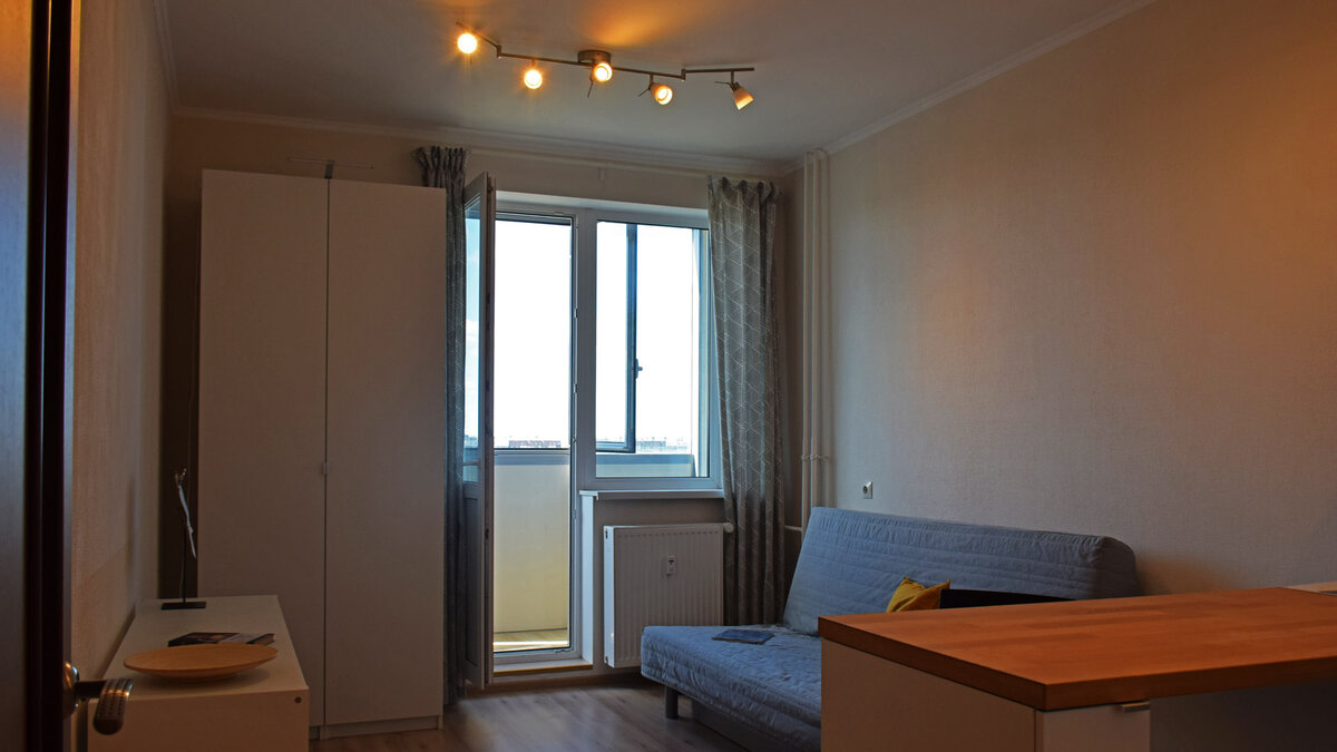 Просторная застекленная лоджия. Высокий 23-ий этаж в 26-этажном новом доме 2016 года постройки. Панорамный вид на микрорайон. Много солнца, много неба. Прямо рядом с домом протекает небольшая речка что делает это место оазисом в каменной пустыне.