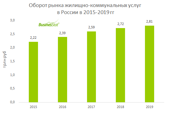 По данным «Анализа рынка жилищно-коммунальных услуг в России», подготовленного BusinesStat в 2020 г, в 2015-2019 гг оборот рынка в стране увеличился на 26,5%: с 2,22 до 2,81 трлн руб. Оборот рос за счет увеличения числа обслуживаемых помещений и повышения тарифов на жилищно-коммунальные услуги. Росту рынка также способствовали строительство жилья эконом-класса, в том числе в рамках госпрограмм обеспечения жильем бюджетников, поддержка ипотечного кредитования и развитие коммунальной инфраструктуры.