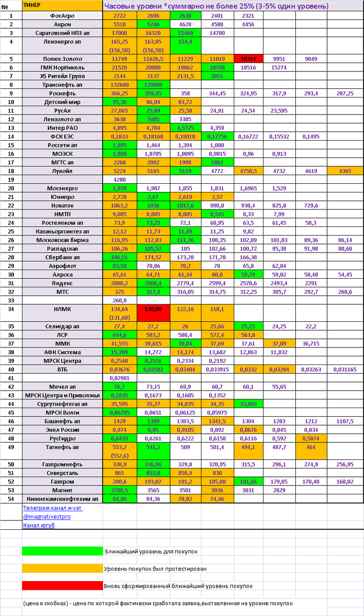Также были сформированы новые часовые уровни покупок (в таблице выделены красным цветом) по акциям: Полюс Золото – 10314; НЛМК – 130,88. ТОРГОВЫЙ ПЛАН на 18 июня 2020 года - инвестиции акции ММВБ В торговом плане на день указаны ближайшие уровни для покупок акций в долгосрок. В случае теста ценой уровня покупок, следующий уровень для покупок по акциям можно узнать из видеообзора, нажав на тайм-код отдельной акции из списка. Видеообзор по акциям на 18 июня 2020 года на моем канале ютуб Хронометраж (тайм-коды) по акциям: Для перехода на телеграм канал в поиске телеграма вбить: @magna